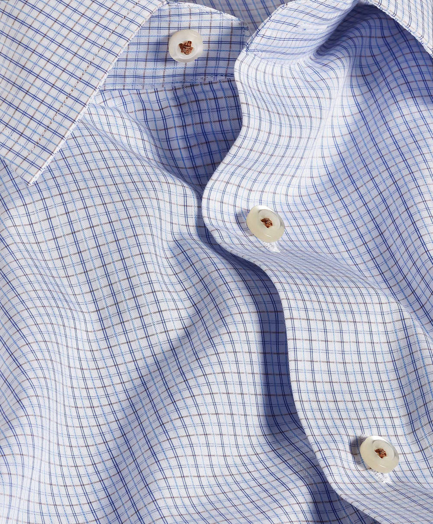 Subtle pattern, precise execution. Crafted from premium cotton and woven in a refined dobby weave, this dress shirt delivers a smooth hand, lightweight breathability, and a clean drape that stays sharp throughout the day. The micro-pattern reads as a modern geometric up close, offering softened contrast that layers seamlessly under tailoring or stands confidently on its own.