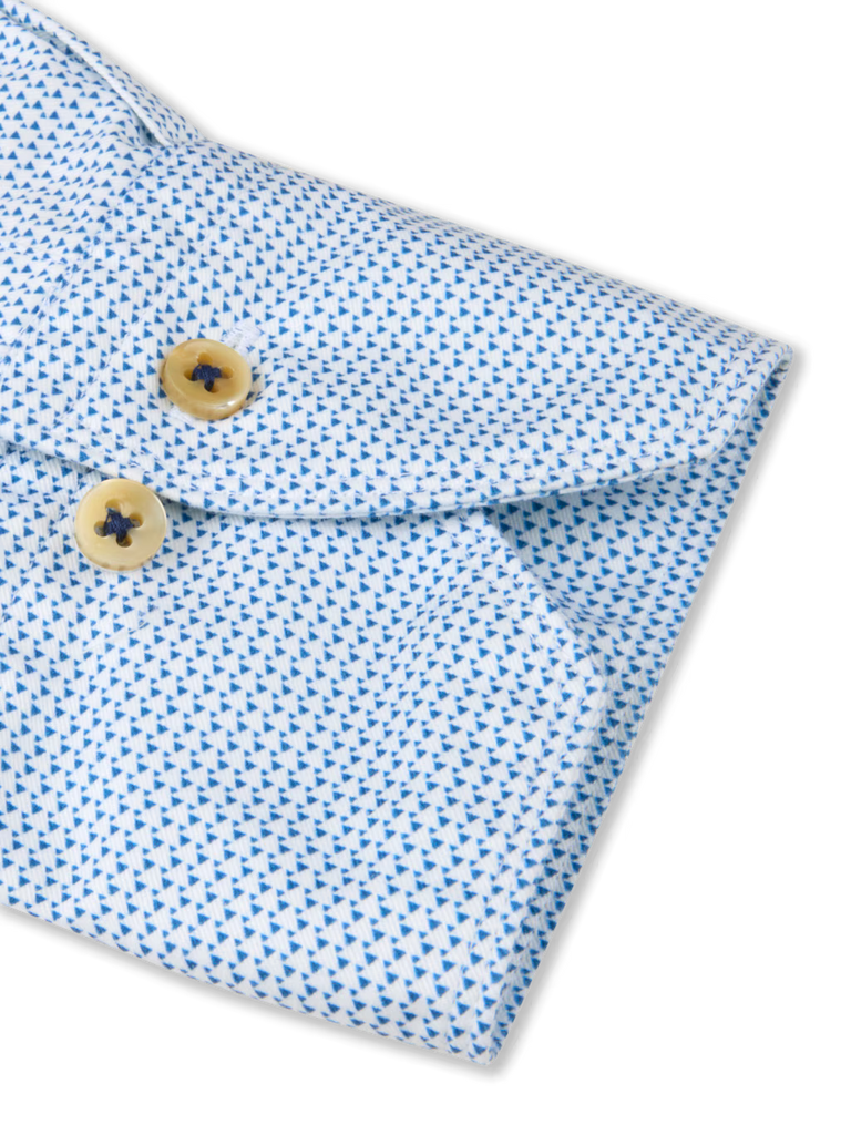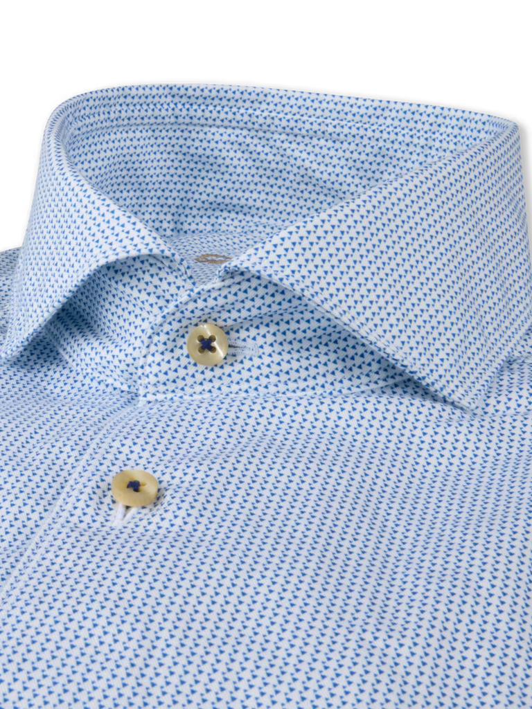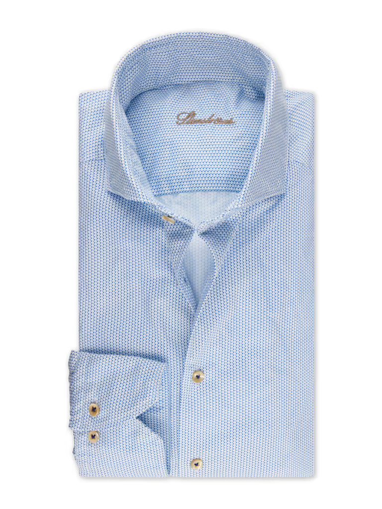 Crafted from premium twofold cotton, this twill shirt features a refined micro pattern that adds subtle depth and visual interest. The smooth twill weave provides structure with a soft hand feel, while genuine mother-of-pearl buttons elevate the finish. Designed with a sharp cut away collar and single cuffs, it delivers a polished silhouette ideal for both business and elevated everyday wear.