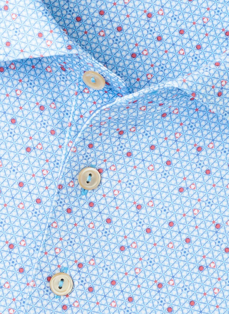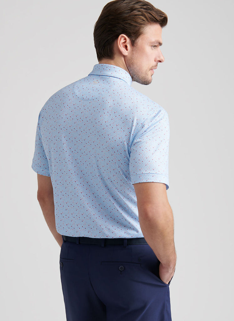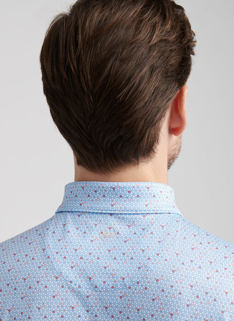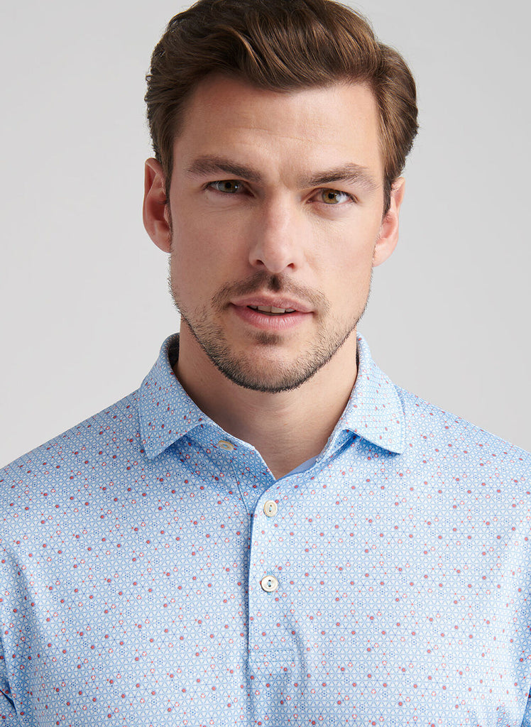 Peter Millar's Summer Comfort jersey polos are gold standards for softness and exceptional performance. These are packed with four-way stretch, wicking and UPF 50+ protection in the signature Summer Comfort fabrication. This shirt features a custom-designed geometric print for added style. Finished with a spread collar and three-button placket.