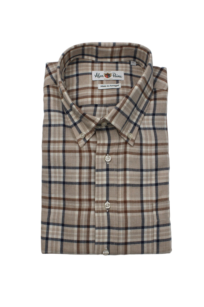 From heritage brand Alan Paine, the Classic Sports Shirt in Brown & Blue Neutral Plaid offers a polished blend of tradition and ease. Crafted from soft, durable cotton, this shirt features a versatile neutral palette that pairs effortlessly with denim, cords, or layered under a seasonal sweater. The tailored silhouette provides a clean, flattering fit without compromising comfort. Finished with thoughtful construction details, it’s a reliable staple for men who appreciate refined British craftsmanship.