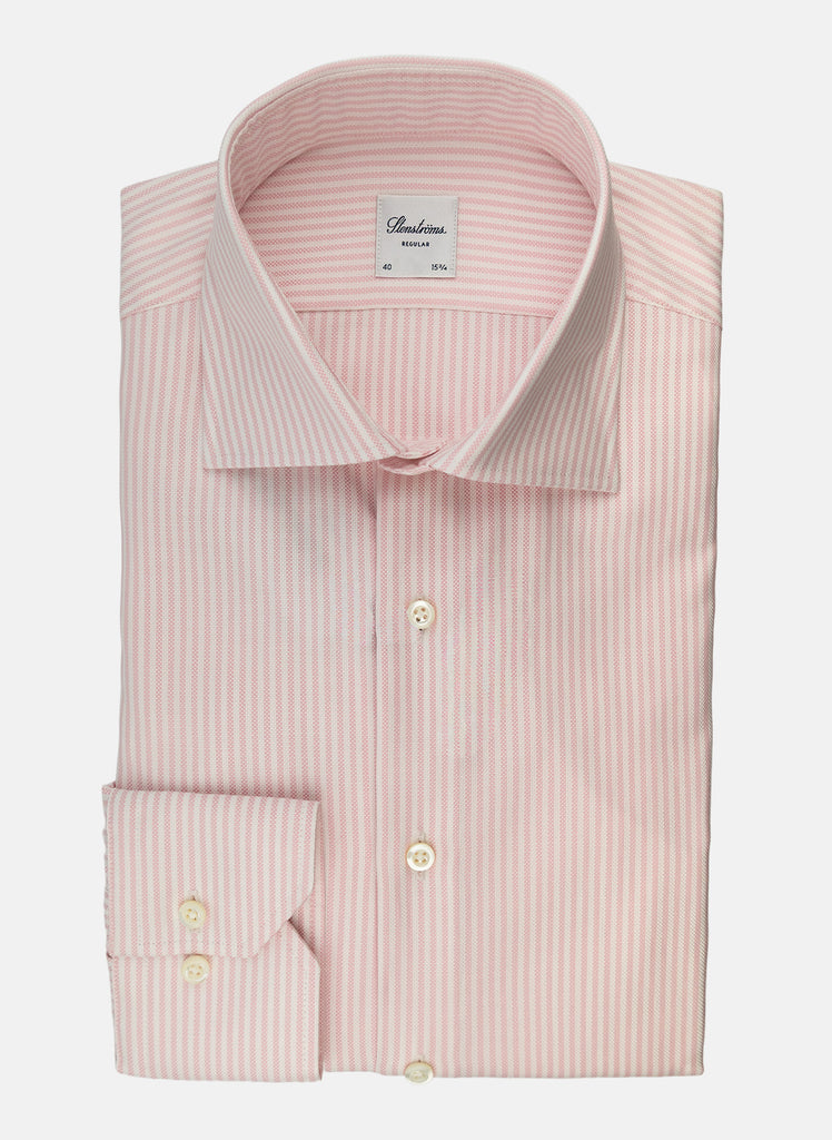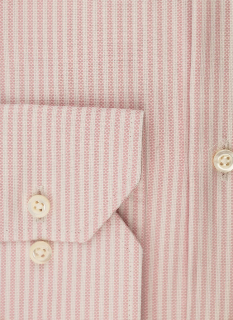 This striped dress shirt is made of cotton. The shirt is detailed with mother of pearl buttons, single cuffs and a cut away collar.