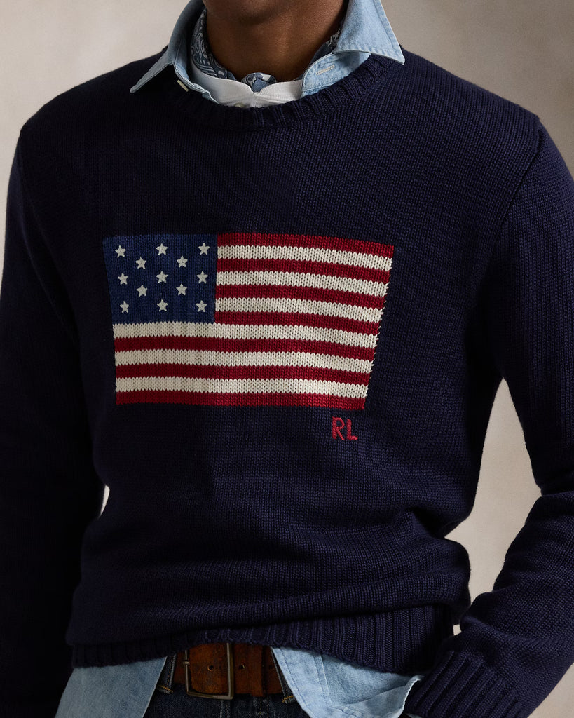 SPECIFICATIONSThe fit of this unisex style is based on standard men's sizing.Regular Fit: wider at the chest while still maintaining a modern silhouette.Crewneck. Long sleeves with rib-knit cuffs.Historical American flag intarsia-knit at the center front. Embroidered stars and “RL” at the front.Rib-knit hem.100% cotton. Machine washable. Made in USA of imported components.HAVE QUESTIONS?