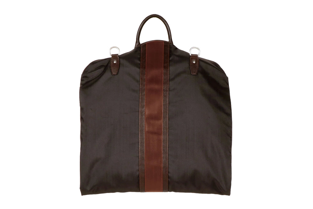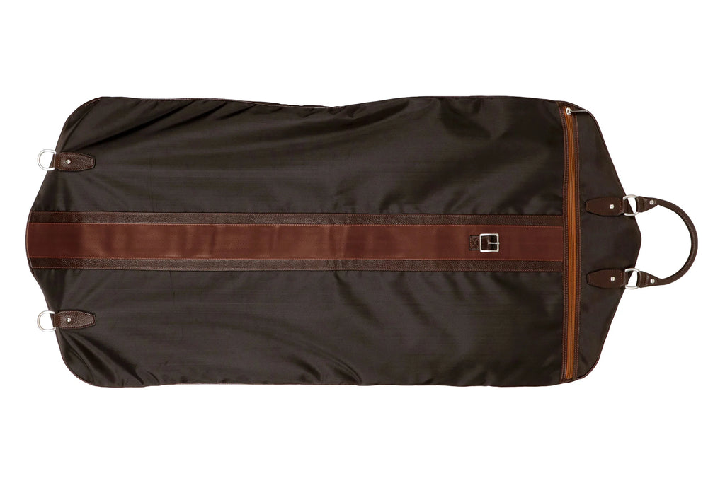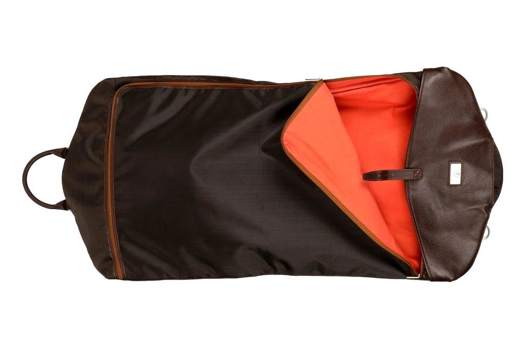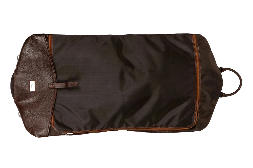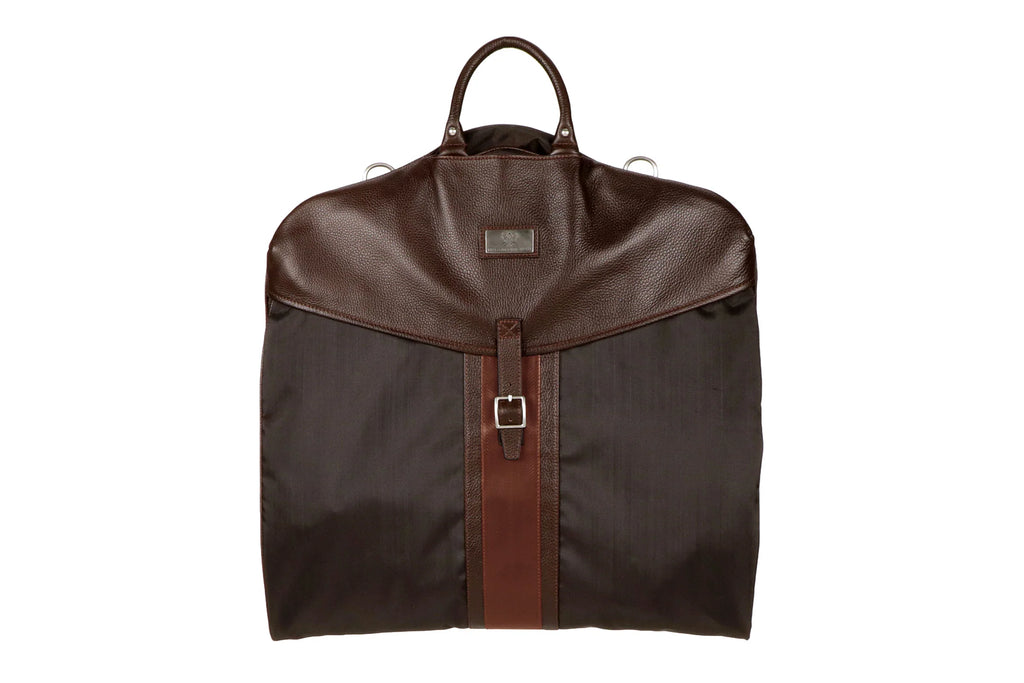 Travel in style with this chocolate-hued classic featuring tumbled saddle leather and ballistic nylon.