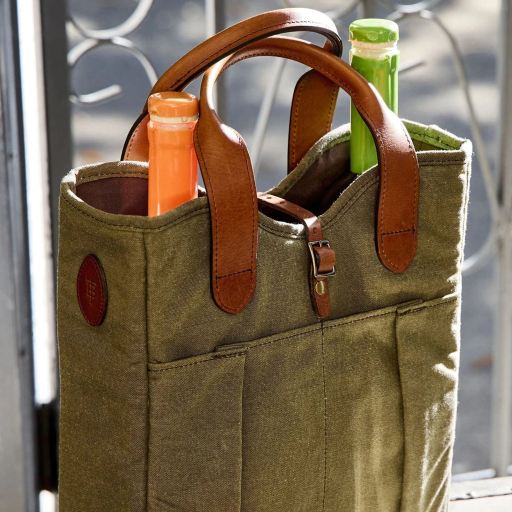 Tom Beckbe's Whiskey Tote is a comfortable carrier for your finest spirits or wine. This whiskey bag was sized to secure two bottles with a padded, removable divider. Complete with full-grain leather handles and a slide-through strap with durable, antique brass hardware. The Whiskey Tote's shell is made from the brand's proven Field Canvas, a unique fabric produced to Tom Beckbe's specifications. Tom Beckbe's Field Canvas provides the classic look and feel of weatherproof waxed cotton canvas with the durability and performance of 1000 denier nylon. Lined with a padded, waterproof synthetic interior liner.
