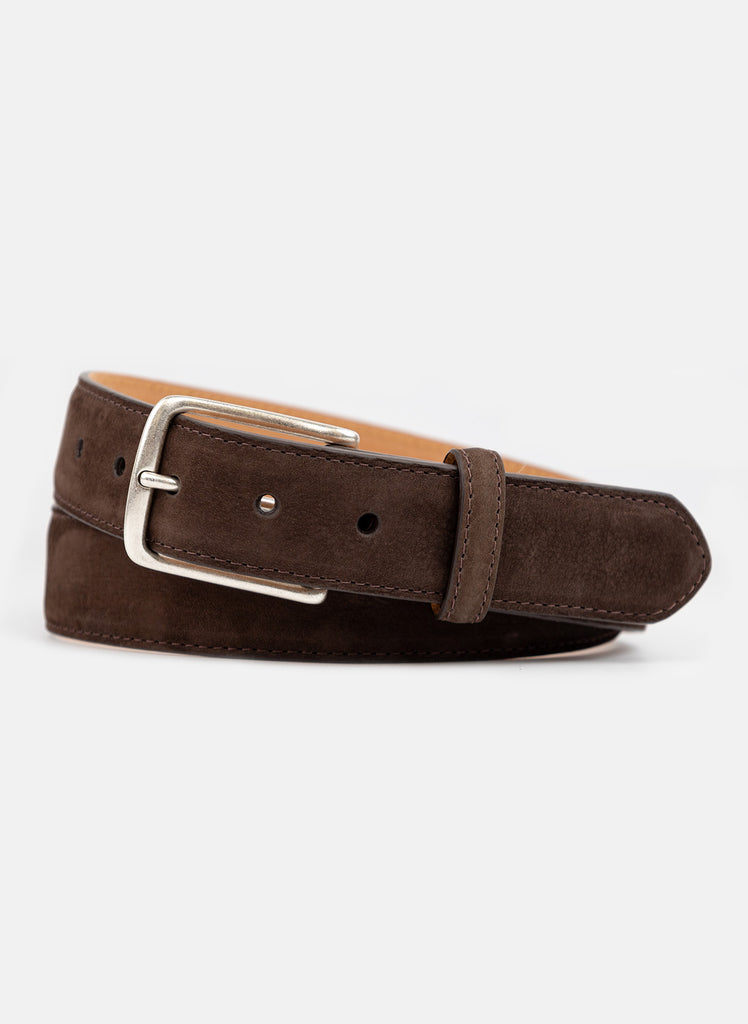 Crafted from premium nubuck calf leather, this 1-3/8" wide belt offers a rich, suede-like texture paired with a soft nubuck lining for lasting comfort. Featuring an antique silver buckle, it combines classic style with durable American craftsmanship, making it a refined accessory for any wardrobe.
