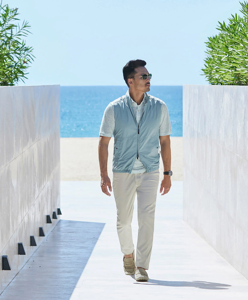 A refined vest designed for effortless layering. Crafted from lightweight, functional materials, it provides warmth without bulk during crisp spring mornings while maintaining a clean, tailored profile. Easily packable and built for life on the go, it pairs seamlessly with a Weekender Polo or worn open over a tee for a more relaxed, everyday look.