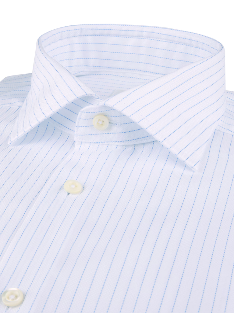 Crafted from premium twofold cotton, this checked twill shirt offers a refined balance of durability and softness. The classic twill weave provides subtle texture and structure, while genuine mother-of-pearl buttons add an elevated finishing touch. Designed with a moderate cut away collar and single cuffs, it delivers a sharp, modern profile that transitions seamlessly from business to evening wear.