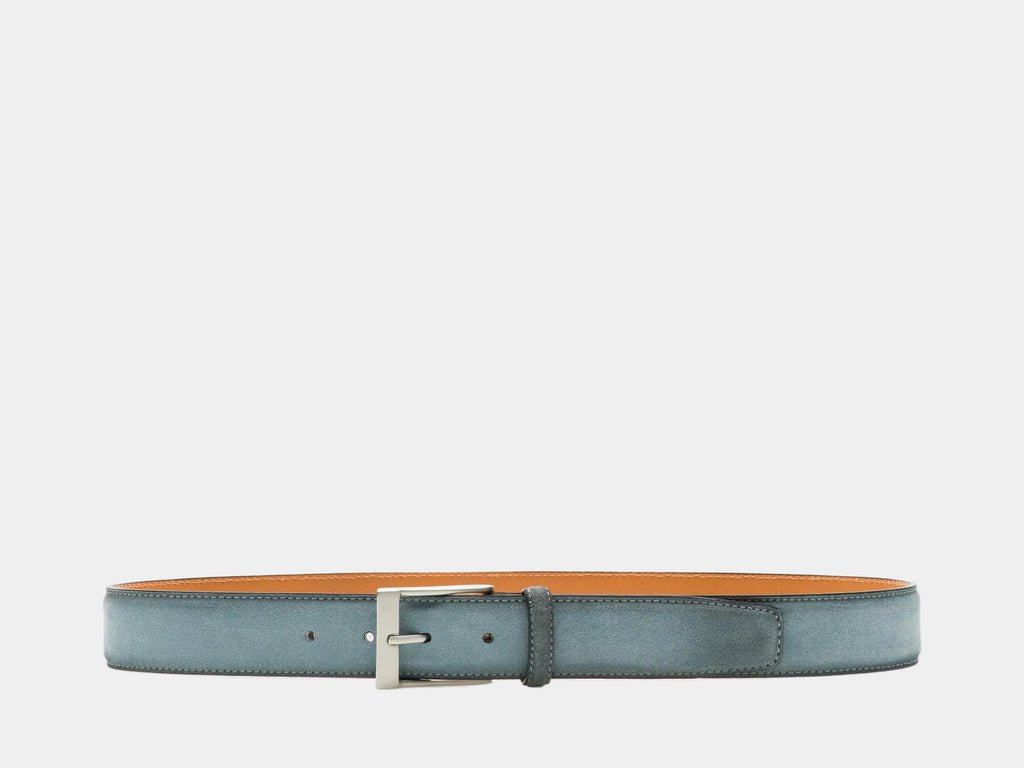 Crafted from soft, supple suede leather, the Telante belt is designed to complement your favorite suede shoes with effortless refinement. Finished in Crostidifu Cement patina, this versatile blue suede style adds depth and texture to both casual and smart-casual looks. A classic square brushed nickel buckle with subtle antiqued detailing delivers timeless character with a modern edge—perfect for the weekend or a relaxed office setting.
